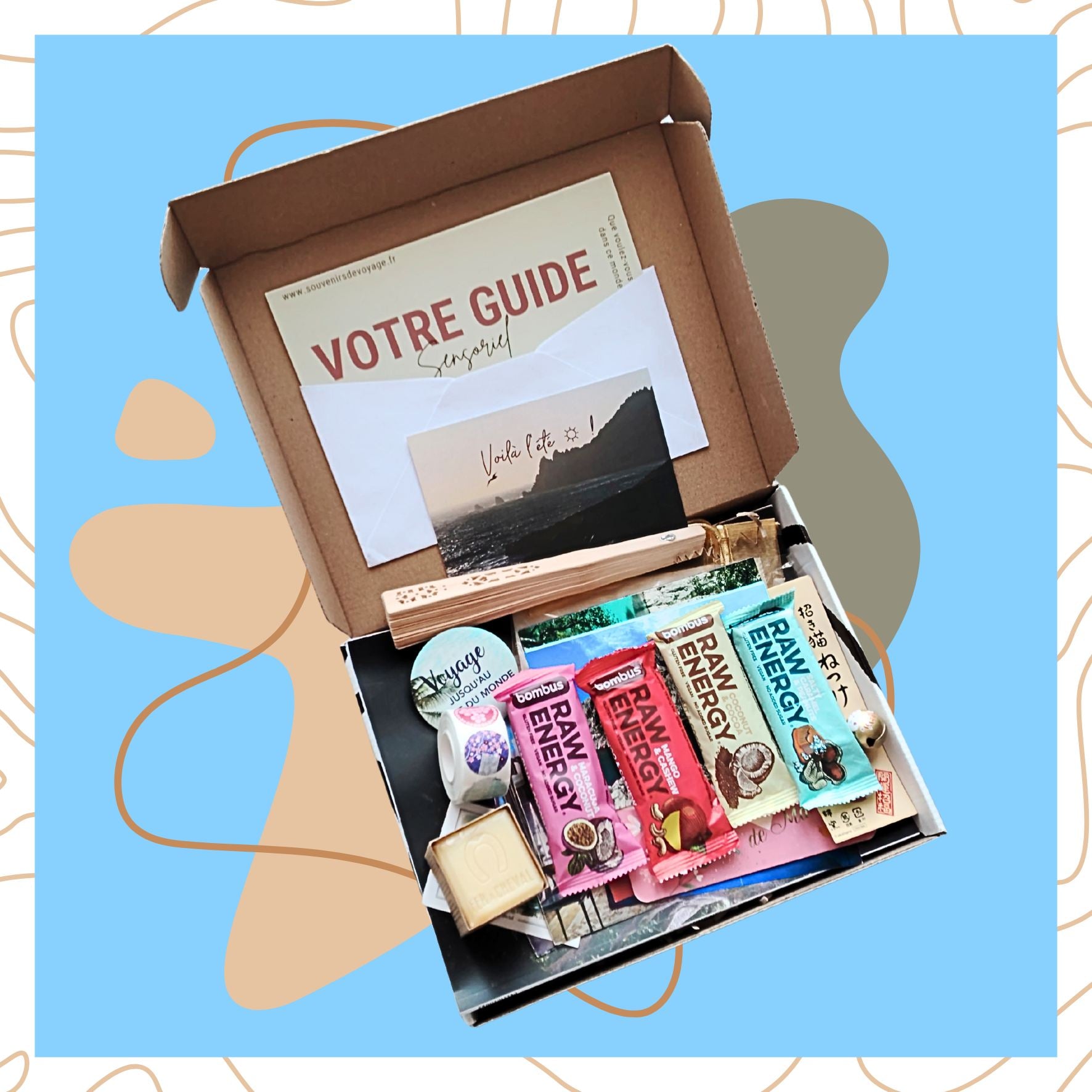 Chaque coffret cadeau renferme une destination surprise à découvrir depuis chez vous : photos, recettes, objets et souvenirs artisanaux sélectionnés avec soin auprès de créateurs locaux.